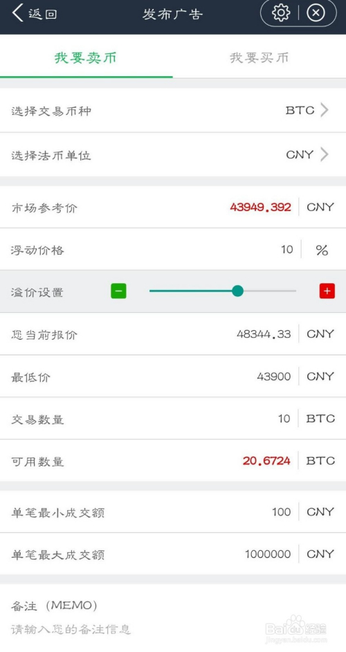 选择”我要卖币/我要买币”——选择买卖币种、法币单元——设置浮动价钱、最低价和买卖数目——设置备注、资金密码及买卖体例——点击“当即发布”