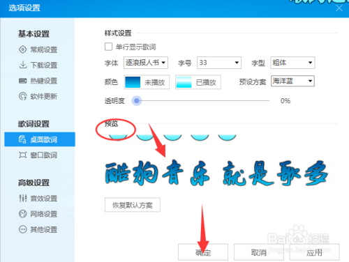 接下来在选项界面中,我们在字体选择我们喜好的字体类型。注重这些字体不是酷狗音乐自带的,而是你电脑系统上所安装有的字体。所以你看到的字体选择会和我的纷歧样。字体的话也可以去网上下载来安装。
