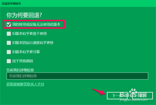 此时会打开一个 回退到时早期版本 的窗口,在 你为何要回退?下,点击选择一个来由,再点击:下一步;