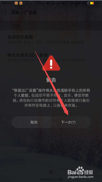 然后在打开的页面中点击下面的 恢复手机出厂设置 按钮;然后会弹出一个倒计时的页面,点击下一步,按照提醒操作,它就可以恢复出厂设置了。