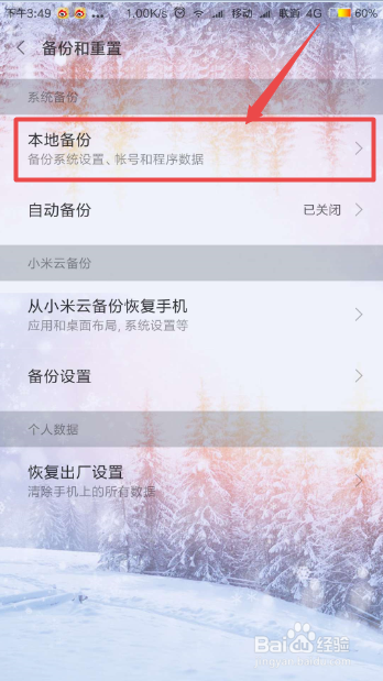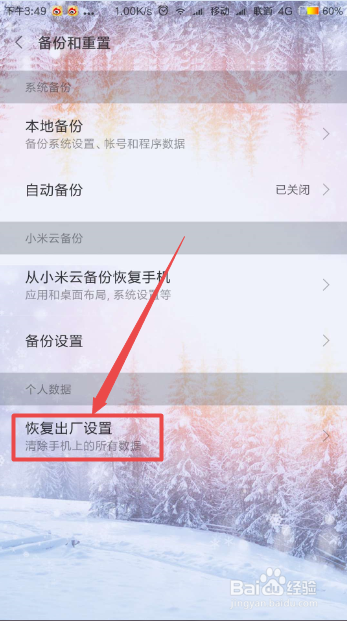 然后在打开的页面中,按照现实需要,将需要备份的内容先备份;备份完当作之后,点击下面的 恢复出厂设置 选项。