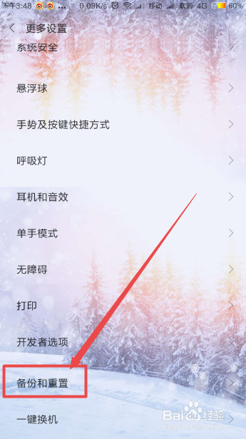 然后在打开的更多设置页面中找到 备份和重置 选项。