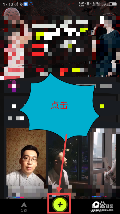 打开yoo有视频后,点击中心的黄色布景的+图标。如图所示