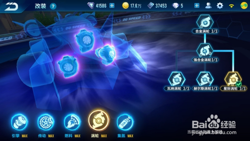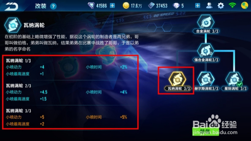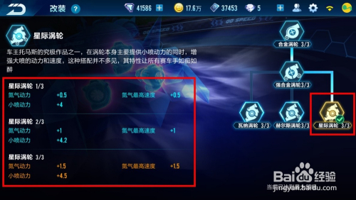 对比“瓦纳涡轮/赫尔斯涡轮/星际涡轮”数据后,发现星际涡轮适合竞速模式(氮气动力+氮气最高速度+小喷动力),所以选择“右分支”