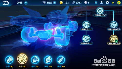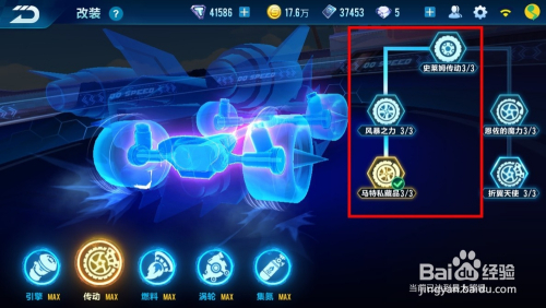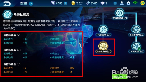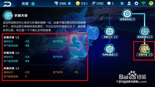 来到“传动改装”,对比“马特斯藏品”和“折翼天使”,数据后,发现折翼天使更适合竞速模式(根本动力+氮气时候+氮气最高速度),所以选择“右分支”