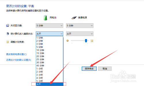 - 建议用电池的环境下不要设置从不,如许电脑电池一会就没电了。