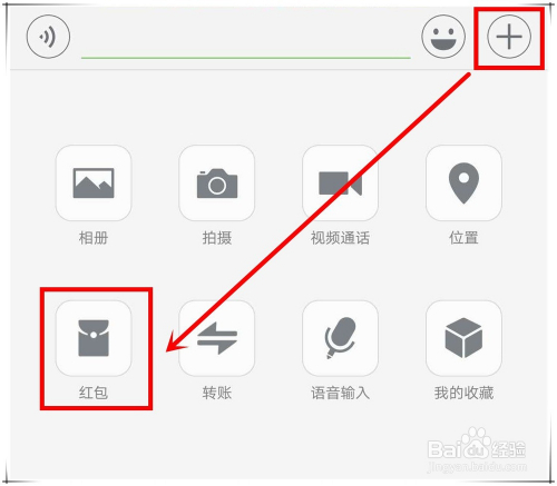 发微信红包步调三:在聊天窗口中,点击“+”按钮,在底部出来的按钮中选择“红包”。
