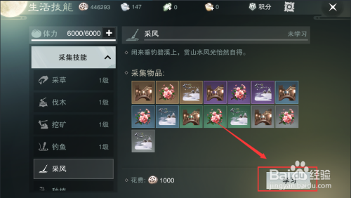 在【采集技术】栏下的找到【采风】技术,然后点击【繁花似锦.隐】旁手型按钮,如图: