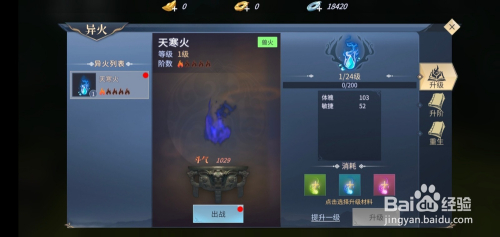 然后我们在里面点击【异火】功能按钮,这个功能需要提高一下脚色品级,就能将这个功能开启,如图所示。