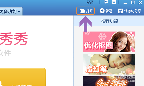 如下图一,我们将最新版的美图秀秀安装到电脑里,然后在软件的右上角点击“打开”选项;
