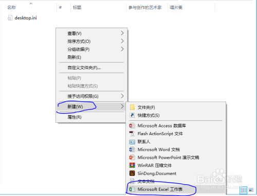 然后选择新建号令二级菜单下的Microsoft Excel工作表。
