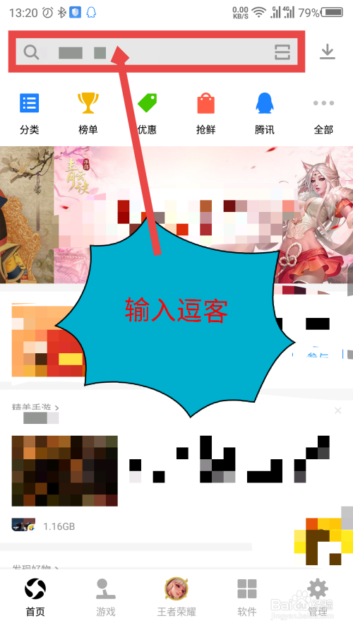 打开应用宝后,在顶部的搜索框中,输入逗客。如图所示