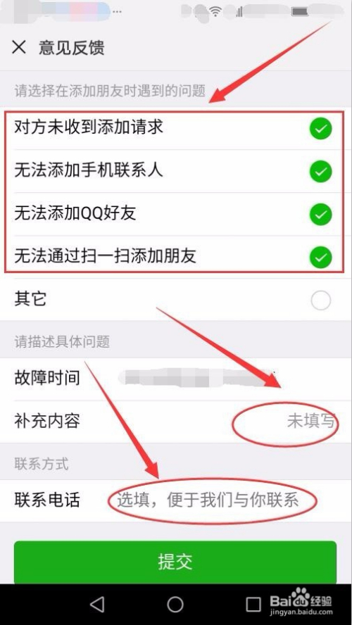 选择添加伴侣时碰到的问题,在弥补内容中输入本身碰到的提醒频仍操作问题,留下本身的联系德律风,单击提交按钮。