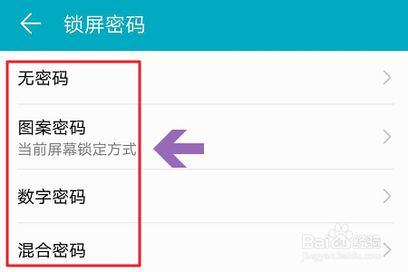 然后即可看到华为手机今朝供给的几种锁屏密码体例了,共有图案密码、数字密码以及组合密码三种,我们以图案密码为例;