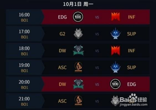 10月1日进行的是A组和B组各步队之间的第一场角逐,代表LPL赛区的EDG的角逐时候别离为下战书16:00和20:00。具体赛程如下图所示。