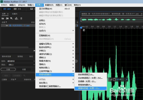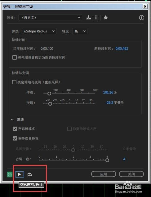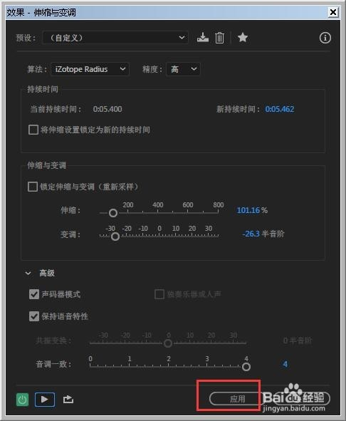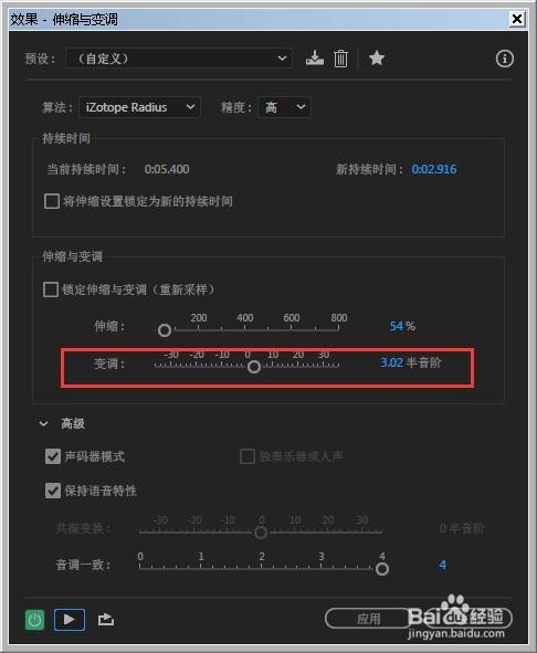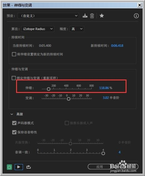 弹出的界面里,调节伸缩:值越高声音速度越慢,值越小声音速度越快