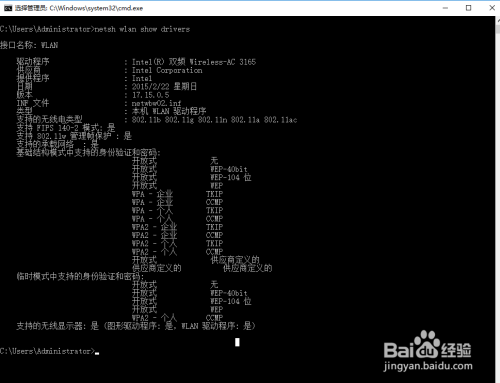 之后進入号令行界面,再次输入一下号令 netsh wlan show drivers ,如下图所示: