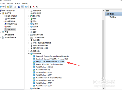 然后找到设备办理器,再选择收集适配器,找到无限网卡,如下图所示: