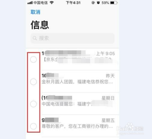 点击编纂后我们就可以看到短信列表中的短信前面都呈现了选择圆圈。