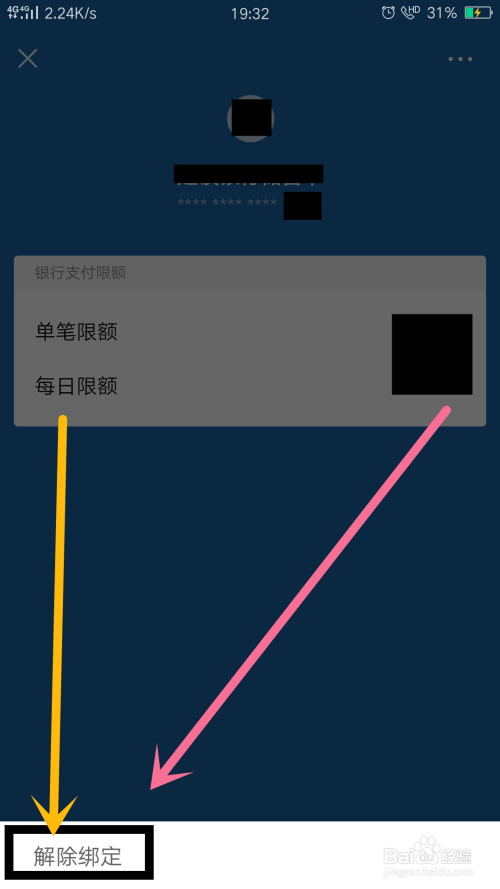 在银行卡菜单中,点击下方的解绑,(输出密码验证身份后,即可解绑)如图所示