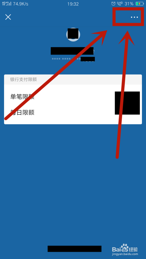在此银行卡页面,点击右上角的菜单按钮,如图所示
