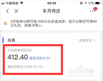 点击当即还条目后,在本月待还中可以看到白条出具的待还账单,点击白条一栏下的待还金额进入还条目流程,如图所示!