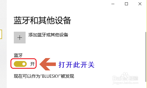 然后就切换到了电脑中的蓝牙开启界面,一般来说蓝牙默认都是封闭着的,手动将其打开即可,如图所示...