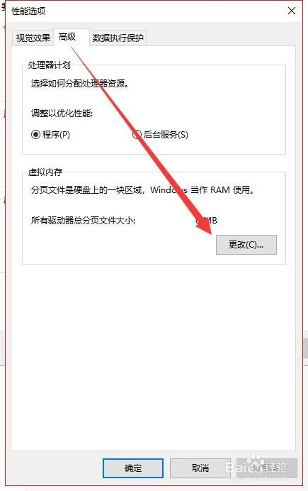 在新的弹窗中找到高级菜单项,然后点击下面的虚拟内存按钮,点击里面的更改