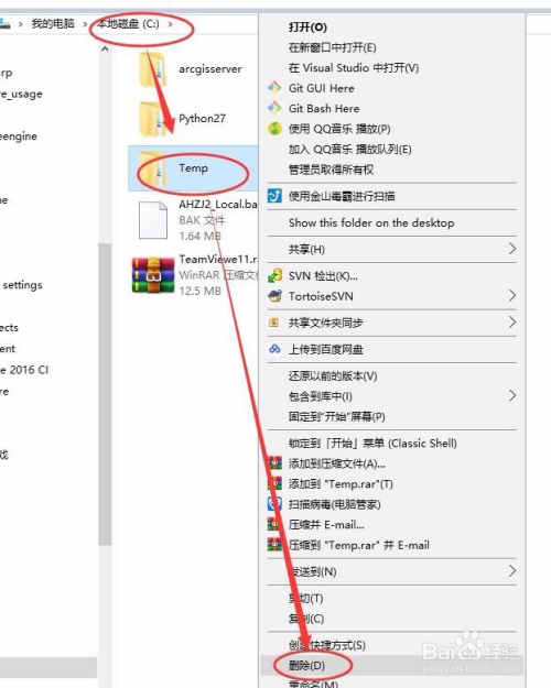 在C盘的windows文件夹下有一个temp,删除即可,如下图所示: