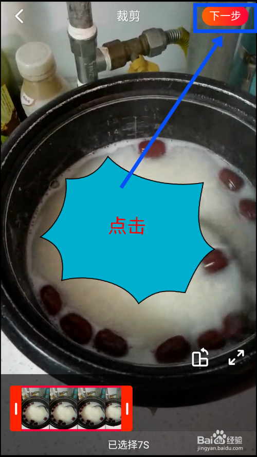 跳转到裁剪界面,调整完当作后,点击右上角的下一步。如图所示