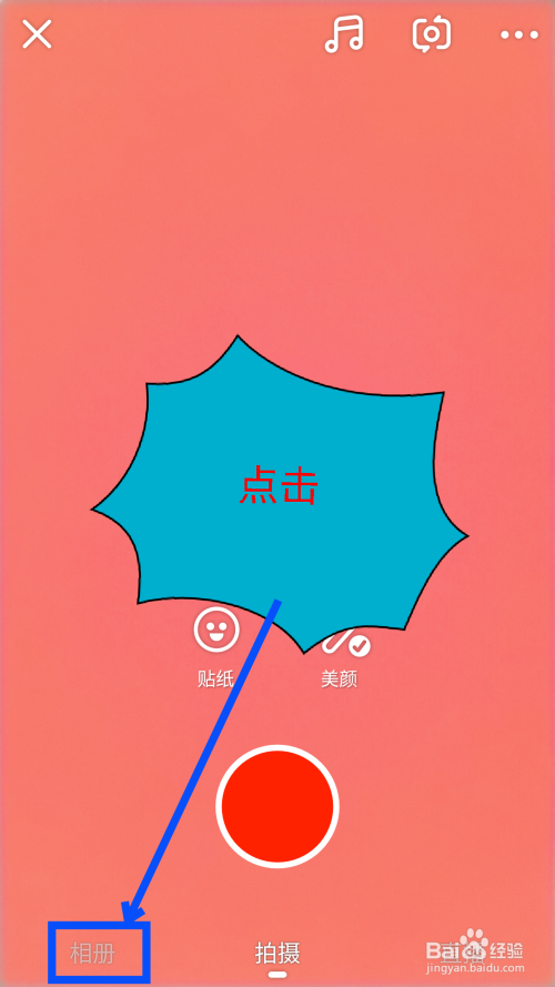 在打开的拍摄界面,点击底部左下角的相册选项。如图所示
