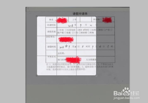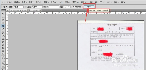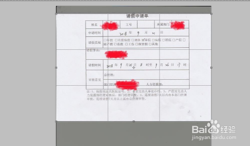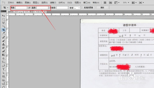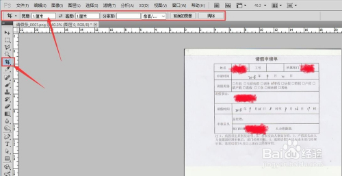 首先利用肆意版本的ps软件打开一张需要裁剪的图片,这里打开了一张扫描的告假条图片。