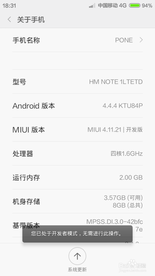 在设置应用中,首先找到“关于手机”栏目,进入该栏目今后,持续点击“MIUI版本”四下,就可以开启开辟者选项。