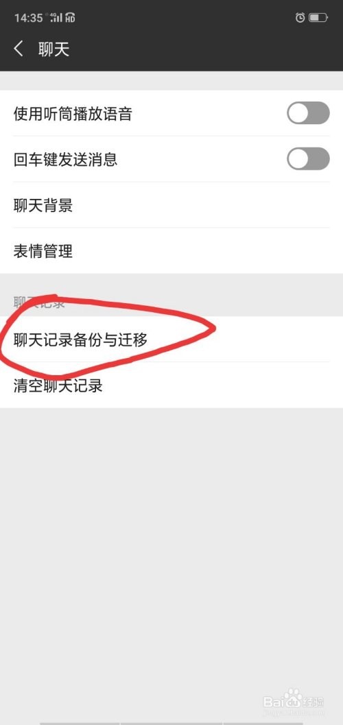 点击设置、聊天、聊天记实备份与迁徙。