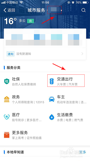 进到城市办事界面后,可以选择你地点的城市,然后在点办事分类--交通出行