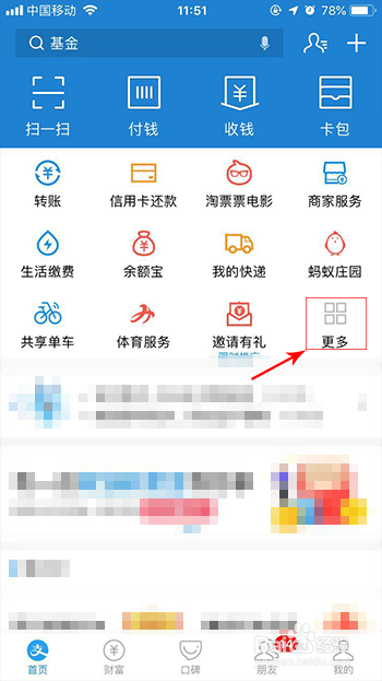 首先打开你的付出宝,若是付出宝首页没有“城市办事”,点更多按钮。