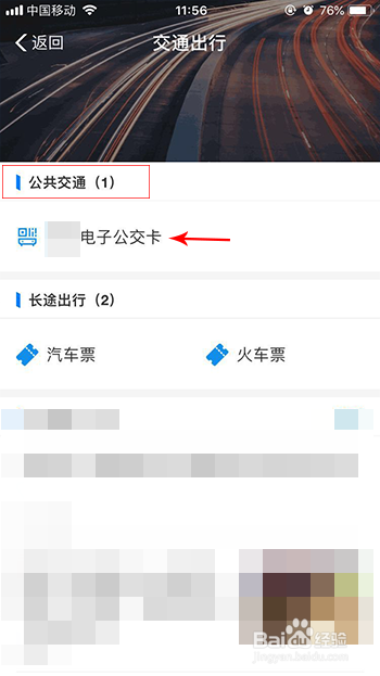 在交通出行界面,若是您地点的城市已开通电子公交卡,就可以看到公共交通下有对应的电子公交卡,点击电子公交卡。