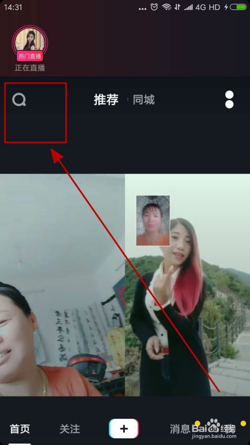 我们打开抖音后,默认的界面是系统的保举页面,我们可以在左上角看到一个放年夜镜样子的图标,这就是搜刮图标,点击进入。