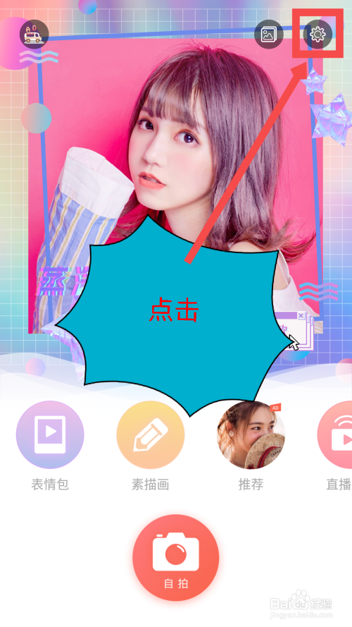 打开相机后,在本家儿界面点击右上角的设置选项。如图所示
