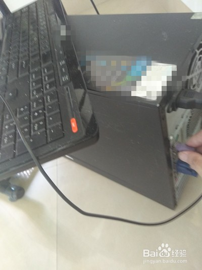 把电脑键盘放在电脑桌上,然后把线拉好,找到电脑本家儿机背后的插口接入。