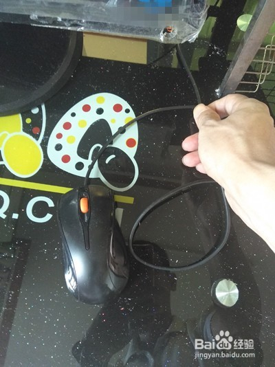 把鼠标放在鼠标垫上,另一端接口,找到本家儿机背后的对应插口插入即可。