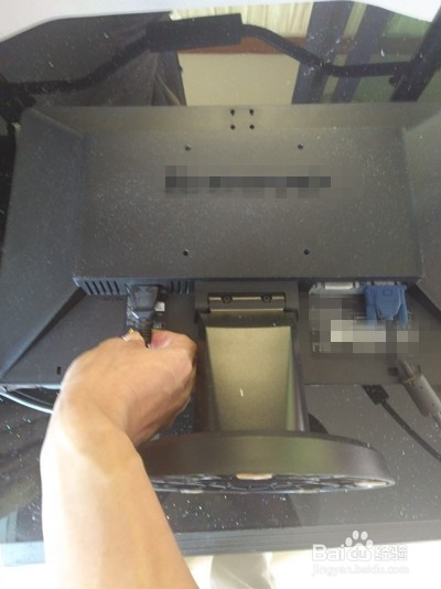 首先需要把显示屏反转过来,把显示器电源插头一头插入,把vga毗连线,毗连在显示器梯形接口上。