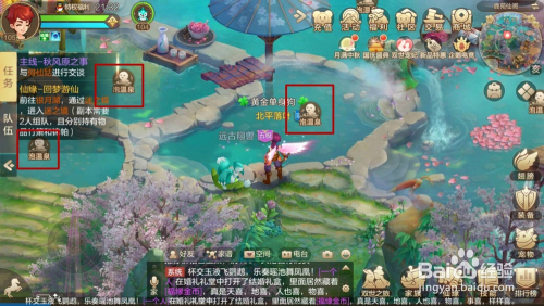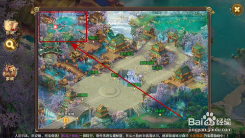 在家族场景,我们点击小地图,可以看到地图左上角是一块水域,我们让脚色前去这一区域。