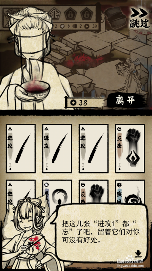 在地图中我们会碰到各类魔鬼,战斗,如图,右上角点击牌库我们可以看到本身的初始牌库,进入游戏会按照你的牌库给你兵器牌,根本牌等