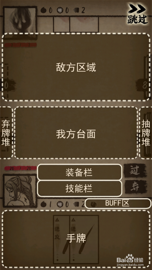 首先,弄法,相信良多人都玩过三国杀等浩繁卡牌游戏,出牌相似,将手牌拖入台面,弃牌堆可以丢弃卡牌,过竣事回合。区域如图