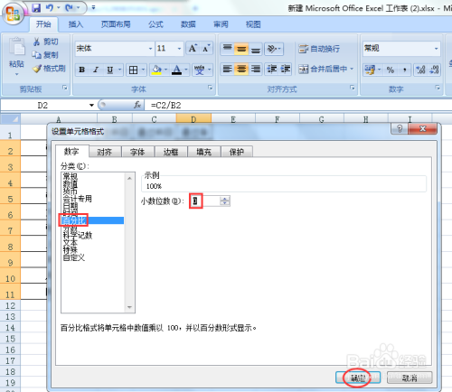 第二步:在“数字”标签中选择“百分比”,同时将小数点位数设置为0。