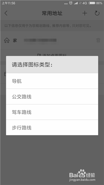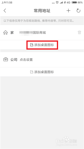 设定好常用地址后返回到常用地址界面,可以看抵家的后面地址已经设定好,我们可以点击下方的【添加桌面图标】。