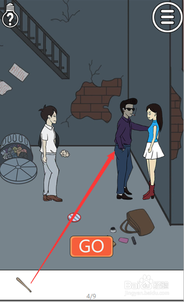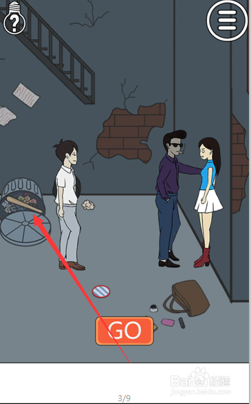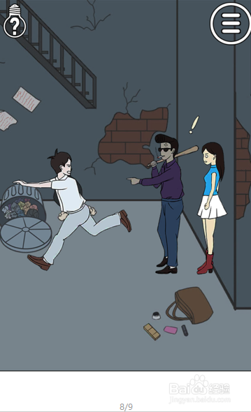 画面中可以看到女本家儿角被一个带着墨镜的小地痞围堵在墙壁了,男本家儿角就站在地痞的背后,我们打翻垃圾桶。