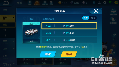首先来说下,光线这辆车怎么获得的,其实很是的简单,打开游戏商场,在B车中就可以找到光线这辆车了。最好的话,就是存点点卷买个永远的,究竟结果颜值摆在这。
