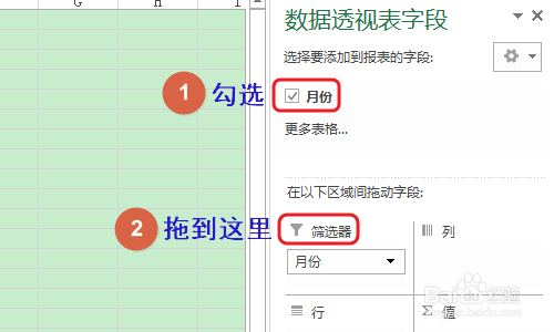 在弹出的数据透视表对话框,我们直接点击确定就行,如许工作表的右侧就会显示图二所示的“数据透视表字段”窗口了,勾选此中的“月份”然后拖动到下方的筛选器里面...